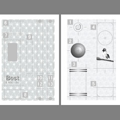 このサンプルは、はがきサイズの用紙2枚に印刷できるように、1枚に表面、もう1枚に裏面・側面のステッカーがデザインされています。