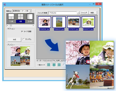 また、選択した写真が指定枚数に達していない場合に自動補完したり、偶然性を楽しむことの出来る、フォルダ内の写真ランダム抽出の機能も搭載し、複数画像合成をよりスムーズに行なうことが出来ます。