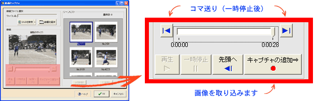 【キャプチャの追加】をクリックすると、映像を取り込みます。【一時停止】をクリックすると、スクロールバーの横にある【コマ送り】ボタンが有効になるので、気に入った映像を取り込む時にとても便利です。ここではお気に入りの画像を複数選択しておきます。