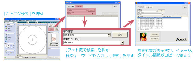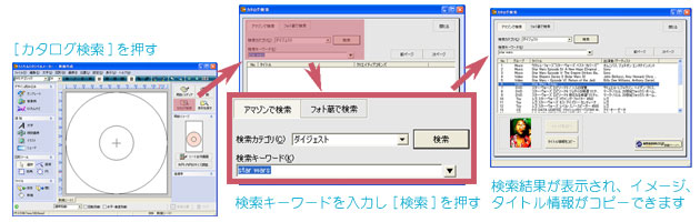 作成した音楽CD用にジャケット画像を、テレビ録画した映画DVD用にパッケージ画像を、それらのタイトル・アーティスト・出演者情報を一発で検索できる便利な機能です。