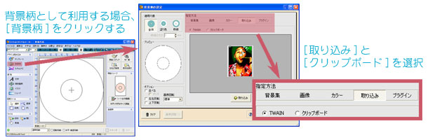 背景柄として呼び出したい場合は、イメージをコピーした後編集画面に戻り【背景柄】をクリックし、指定方法を「取り込み」にして「クリップボード」を選択します。するとコピーした画像が表示されるので、【貼り付け】→【OK】とクリックする事でイメージを使用できます。