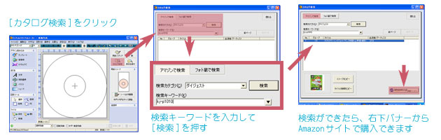 【カタログ検索】ボタンを押します。そして、「アマゾンで検索」を押してから検索キーワードを入力し【検索】ボタンを押せば、入力したキーワードに該当する作品が表示されます。さらに絞って検索したい場合は、[検索カテゴリ]から[Music]・[DVD]、どちらか検索したいジャンルを選択します。