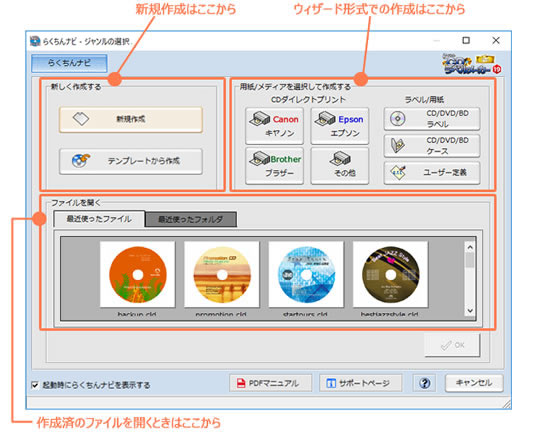 「らくちんナビ」の「用紙/メディアを選択して作成する」からは、画面に従って用紙・デザインを選んで、文字情報を入力してすぐに印刷することができます。