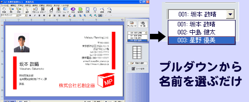 プロフィール項目のオブジェクトが配置された名刺を利用すれば、名刺のデザインを変更することなく、プロフィール情報のみを切り替えることができます。