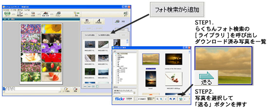 「らくちんフォトプリント」から「らくちんフォト検索」の[ライブラリ]を呼び出すことができます。ダウンロード済みの写真を選んで、ワンクリックで背景柄として貼り付けることが出来ます。複数写真を選んで、複数イメージをまとめて送ることも出来ます。