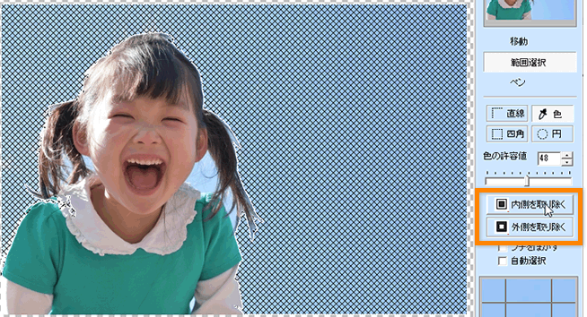 色選択機能や直線、図形ツールで範囲を選択後、「内側を取り除く」「外側を取り除く」のボタンにマウスを合わせると、切り抜かれる部分が網掛け表示になり、切り抜き部分がわかりやすくなりました。
