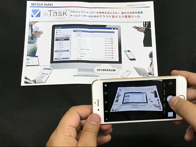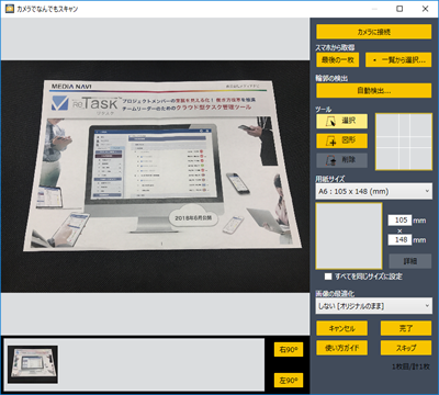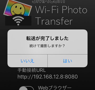 「SMACom Wi-Fi写真転送」のカメラで、スキャンしたい対象物を撮影します。 ![]() できるだけ輪郭を見やすくする為、文書の色が明るい場合は黒いものを背景に、暗い色の場合は白いものを背景にすることをお勧めします。 照明や太陽光など反射する場合は、文書に対して少し角度をつけて撮影をすると綺麗に保存できます。 撮影が終わり、保存をすると自動的にパソコン側の「カメラでなんでもスキャン」に写真が転送されます。 ![]() 転送が完了すると、「続けて撮影しますか?」というメッセージが表示されますので、続けて次のページを撮影する場合は「はい」を選んで撮影をしてください。 撮影を終了する場合は「いいえ」で閉じます。 ![]() 撮影が完了したら、パソコン側の「カメラでなんでもスキャン」のスキャン補正の手順に入ります。