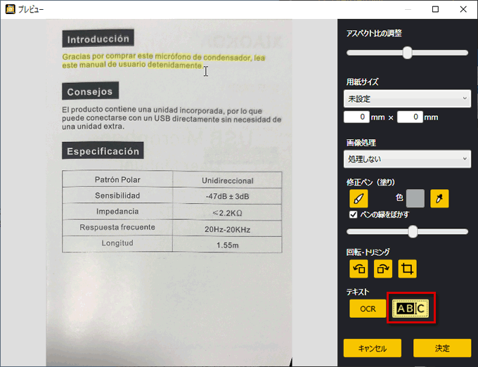 OCR文字解析済のテキストをプレビュー画面で表示し、テキストメニューの[テキスト選択]ボタンを選択します。